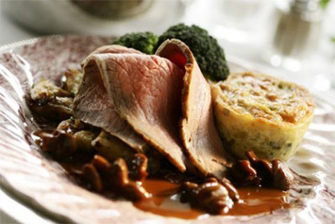 | Kalvekølle med svampesauce og årstidens grøntsager |